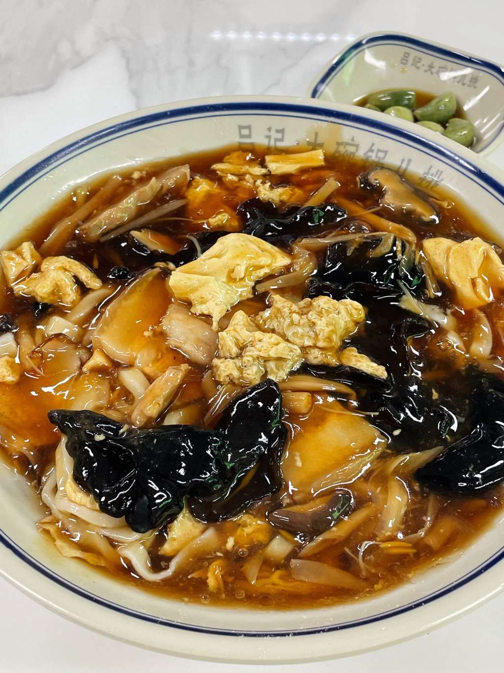 这卤里面有大海米,五花肉片,猪血片,木耳,鸡蛋,黄花菜,(或香菇)最后洒上香菜、淋上香油。